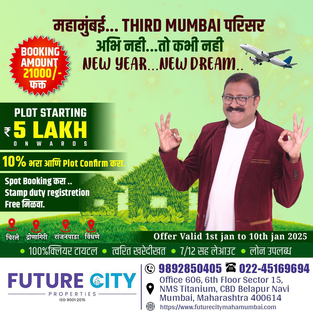 Future City MahaMumbai is established in 2022. We are ready to serve open plot in smart City & also flats in Navi Mumbai, Panvel & Ulwe. Looking forward to generate happy faces of Property holders. We are in market to present all legal properties best deal with 100% transparency to our clients. Future City MahaMumbai is the firm providing raw land to your dream home. Future City MahaMumbai are having Undeveloped/Cidco/Agriculture land in upcoming smart City. Also we are providing Flats in Navi Mumbai, Ulwe & Panvel with clear title and RERA registered. We are leading land developers offering N.A plots , Residential, Commercial lands in Navi Mumbai & Kokan Regions. Our projects extend across several locations in and out skirts of Navi mumbai & Kokan Regions.